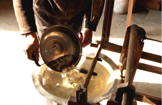 輯里湖絲原產(chǎn)于南潯鎮(zhèn)郊七里之遙的輯里村。輯里村自元末開始養(yǎng)蠶制絲。明萬歷年間,當(dāng)?shù)馗牧夹Q種、精進(jìn)繅絲工藝,使絲質(zhì)具備“細(xì)、圓、勻、堅、白、凈、柔、韌”八大特色,品質(zhì)極為出眾。據(jù)明朱國楨《涌幢小品》記載:“湖絲唯輯里尤佳,較常價每兩必多一分?!?/p>