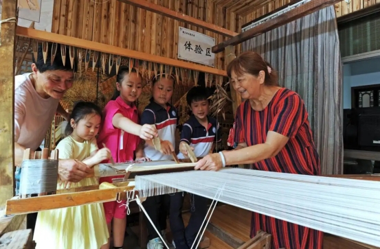 館長王一士(左一)和妻子計金妹(右一)在輯里湖絲博物館向小朋友講述手工緙絲技藝