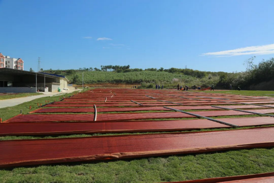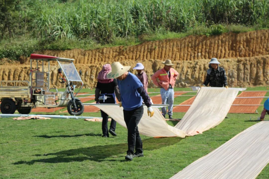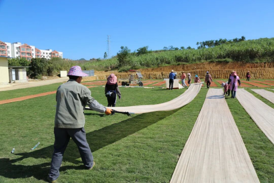 11月21日,記者走進忻城縣高端紡織制造示范園,一幅頗具規(guī)模的曬布場景映入眼簾——工人們正將一匹匹褐黃色的香云紗布料在陽光下展開、晾曬。這些面料不久后將被制成服裝,銷往國內(nèi)外市場。這一場景背后,是忻城縣推動繭絲綢產(chǎn)業(yè)升級的關(guān)鍵一步。