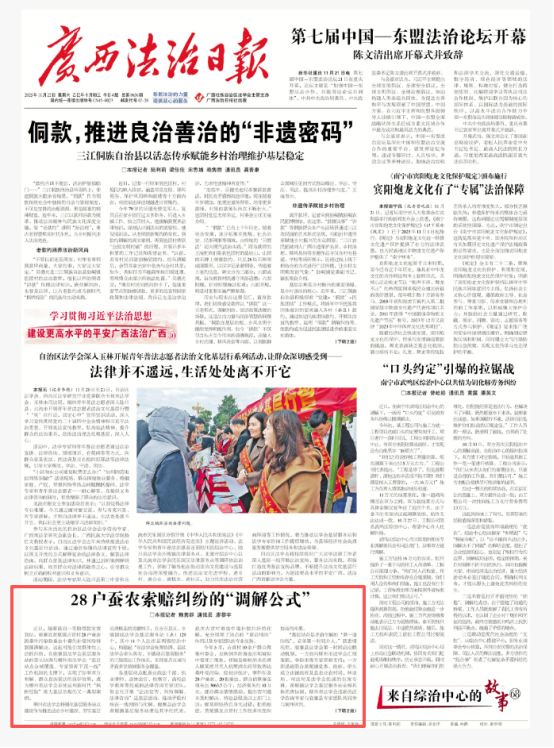 近日,隨著最后一筆賠償款發(fā)放到位,鹿寨縣黃冕鎮(zhèn)古賞村28戶蠶農(nóng)因桑葉污染致蠶蟲中毒的補(bǔ)償糾紛得到圓滿解決。這起可能引發(fā)群體性上訪的糾紛,在鹿寨縣法學(xué)會(huì)基層服務(wù)站的牽頭協(xié)調(diào)與柳州市法學(xué)會(huì)“基層站點(diǎn)全域覆蓋、專家資源下沉一線”工作機(jī)制的支撐下,實(shí)現(xiàn)了涉事雙方和解、群眾息訴罷訪的良好效果,成為柳州市法學(xué)會(huì)系統(tǒng)運(yùn)用新時(shí)代“楓橋經(jīng)驗(yàn)”助力基層治理的又一典型案例。