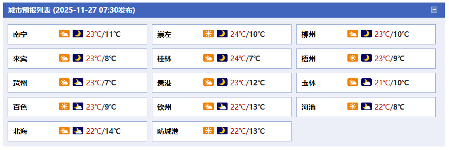 28日白天到晚上,全區(qū)晴到少云,高寒山區(qū)局地有霜凍。最低氣溫:高寒山區(qū)-1~4℃,桂北4~10℃,桂南6~13℃。