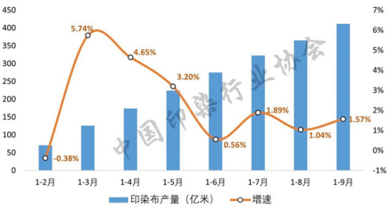圖1 2025年前三季度我國印染行業(yè)規(guī)模以上企業(yè)印染布產(chǎn)量及增速