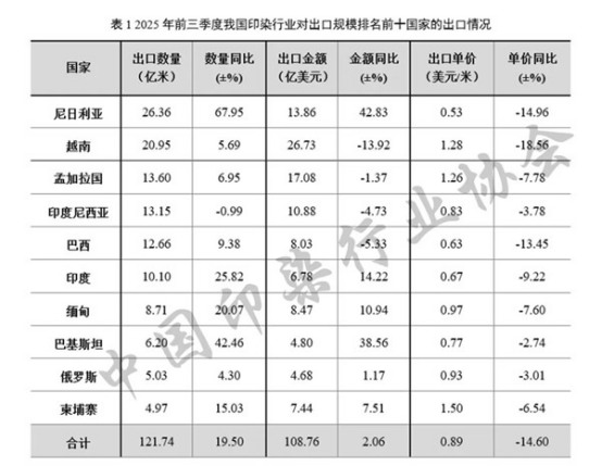 面對復雜的全球貿(mào)易環(huán)境,我國印染企業(yè)積極調(diào)整產(chǎn)品結(jié)構(gòu),持續(xù)拓展“一帶一路”沿線國家和非洲等國際市場。前三季度,我國印染行業(yè)出口規(guī)模排名前十的國家出口數(shù)量121.74億米,同比增長19.50%,高于整體增速7.20個百分點,其中,對尼日利亞、巴基斯坦、印度出口數(shù)量分別大幅增長67.95%、42.46%和25.82%,對緬甸和柬埔寨出口數(shù)量增速均高于對全球出口整體增速。對前十國家的出口平均單價降幅高于整體水平3.81個百分點,其中對越南、尼日利亞和巴西出口平均單價降幅分別達到18.56%、14.96%和13.45%。