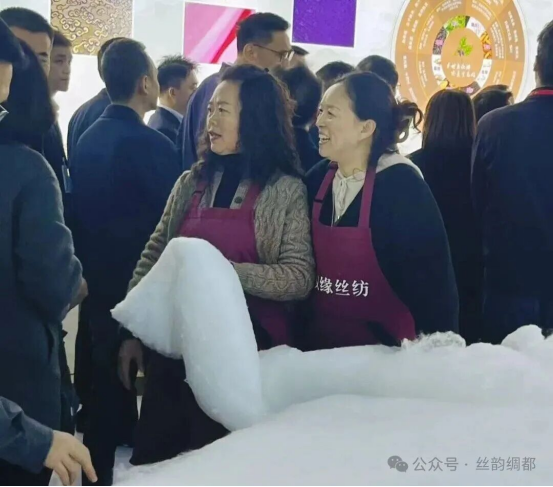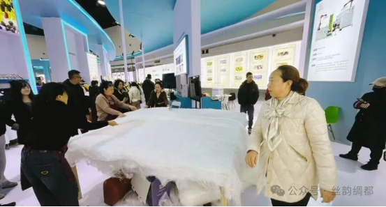 漢緣絲綢的展位前,人頭攢動、絡(luò)繹不絕。不同于常規(guī)展示,企業(yè)特意安排工人現(xiàn)場展演蠶絲被制作技藝——蓬松輕柔的絲棉在指尖舒展,光澤細膩溫潤,這背后是企業(yè)獨有的鮮繭取絲工藝在發(fā)力?!拔覀儓猿钟悯r繭直接取絲,能最大程度保留蠶繭的天然繭素和瑩潤光澤?!爆F(xiàn)場負責人介紹,公司不僅選用100%正繭上等絲棉,更在省內(nèi)首創(chuàng)鮮正繭絲棉片手工制被技術(shù)。展位上,市纖維檢驗所出具的47項全合格檢驗報告與市級非遺認證牌匾并排陳列,讓消費者買得安心?!懊饋硐裨贫湟粯榆?,又有這么多保障,果斷給父母也帶一套?!眲偺嶙邇纱残Q絲被的張先生笑著說。