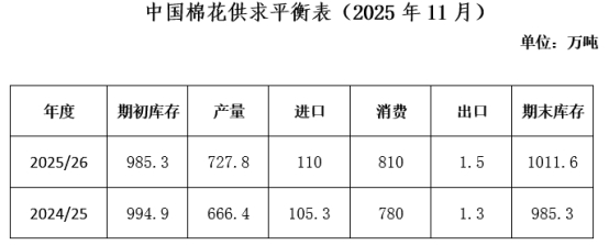 中國(guó)棉花協(xié)會(huì)預(yù)測(cè):2025/26年度全國(guó)棉花產(chǎn)量727.8萬噸,同比增長(zhǎng)9.2%;棉花進(jìn)口量110萬噸,同比增長(zhǎng)4.5%;消費(fèi)量810萬噸,同比增長(zhǎng)3.8%,期末庫存為1011.6萬噸,同比增長(zhǎng)2.7%。