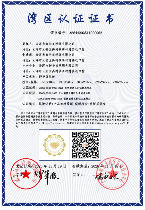 近日,云浮市御華繭絲綢有限公司的“御華蠶絲被”獲得灣區(qū)認(rèn)證證書,這是全國蠶絲被行業(yè)首張灣區(qū)認(rèn)證證書,標(biāo)志著云浮特色蠶絲制品成功對(duì)接大灣區(qū)高端市場(chǎng),成為云浮打造“南江蠶桑”品牌的重要節(jié)點(diǎn)成果。