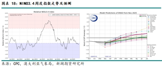 當(dāng)前全球氣候有弱拉尼娜跡象,NINO3.4周度指數(shù)截止11月23日已經(jīng)跌至-0.93。美國(guó)氣候預(yù)測(cè)中心(CPC)預(yù)估,弱拉尼娜現(xiàn)象將持續(xù)至北半球冬季,有可能2026年1月至3月過渡為ENSO中性狀態(tài)(61%概率)。