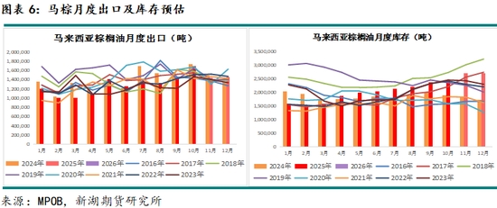 庫(kù)存: 10月馬棕庫(kù)存增至246萬噸,處于歷史同期偏高水平。目前出口預(yù)估看,11月馬棕庫(kù)存預(yù)計(jì)繼續(xù)增加,或增至260-270萬噸,重點(diǎn)看11月產(chǎn)量的環(huán)比減幅。馬棕現(xiàn)實(shí)供需壓力依舊較大。12月馬棕出口仍可能偏弱,當(dāng)月庫(kù)存難有明顯下降。