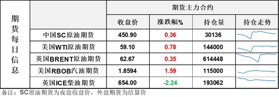 【1】WTI主力原油期貨收漲0.46美元,漲幅0.78%,報59.1美元/桶;布倫特主力原油期貨收漲0.22美元,漲幅0.35%,報62.67美元/桶;INE原油期貨收漲0.36%,報450.9元。