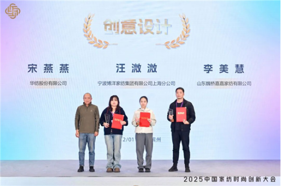 競賽副總裁判長、江南大學教授、博士生導師、高級家紡設計師張毅為“創(chuàng)意設計”單項獎第一名寧波博洋家紡集團有限公司上海分公司汪溦溦、第二名山東魏橋嘉嘉家紡有限公司李美慧、并列第二名華紡股份有限公司宋燕燕頒獎。
