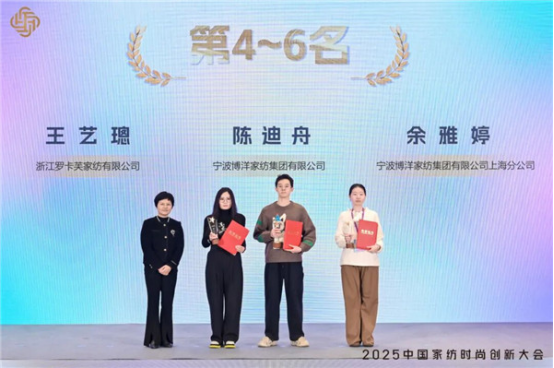 朱曉紅為全國決賽第四名寧波博洋家紡集團有限公司陳迪舟、第五名寧波博洋家紡集團有限公司上海分公司余雅婷、第六名浙江羅卡芙家紡有限公司王藝璁頒獎。