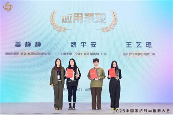 中國家用紡織品行業(yè)協(xié)會副會長吳永茜為“應用表現(xiàn)”單項獎第一名知眠七星(寧波)家居有限責任公司魏平安、第二名浙江羅卡芙家紡有限公司王藝璁、第三名鑫帕特娜絲(青島)家居飾品有限公司姜靜靜頒獎。