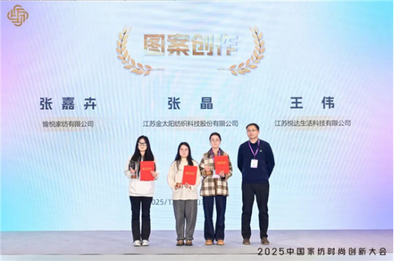 中國財貿(mào)輕紡煙草工會紡織工作部副部長周晨為“圖案創(chuàng)作”單項獎第一名江蘇金太陽紡織科技股份有限公司張晶、第二名江蘇悅達生活科技有限公司王偉、第三名愉悅家紡有限公司張嘉卉頒獎。