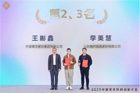王雙清為全國決賽第二名寧波博洋家紡集團有限公司王彬鑫、第三名山東魏橋嘉嘉家紡有限公司李美慧頒獎。