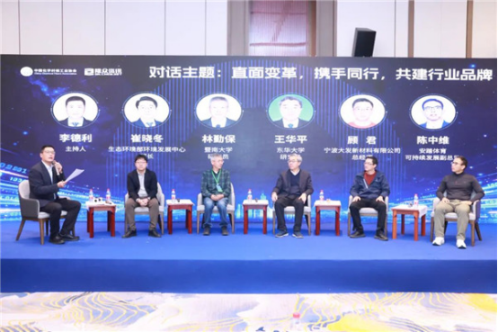 在對話環(huán)節(jié),主持人中國化學(xué)纖維工業(yè)協(xié)會循環(huán)再利用化學(xué)纖維分會秘書長李德利與東華大學(xué)研究員王華平、暨南大學(xué)教授林勤保、生態(tài)環(huán)境部環(huán)境發(fā)展中心部長崔曉冬、寧波大發(fā)新材料有限公司總經(jīng)理顧君、安踏集團(tuán)可持續(xù)發(fā)展副總監(jiān)陳中維,圍繞循環(huán)再利用化學(xué)纖維行業(yè)發(fā)展趨勢、品牌方對再生材料需求及要求、生產(chǎn)工藝技術(shù)路徑選擇、經(jīng)濟(jì)效益和社會效益的矛盾與抉擇、再生纖維鑒別方法及應(yīng)用、碳匯核算機制等行業(yè)焦點問題展開深入探討。