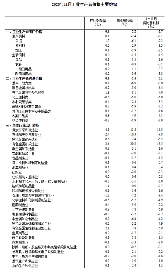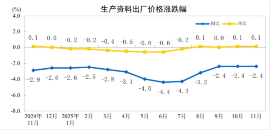 2025年11月份,全國工業(yè)生產(chǎn)者出廠價格同比下降2.2%,工業(yè)生產(chǎn)者購進價格同比下降2.5%;工業(yè)生產(chǎn)者出廠價格和購進價格環(huán)比均上漲0.1%,漲幅均與上月相同。1—11月平均,工業(yè)生產(chǎn)者出廠價格比上年同期下降2.7%,工業(yè)生產(chǎn)者購進價格下降3.1%。