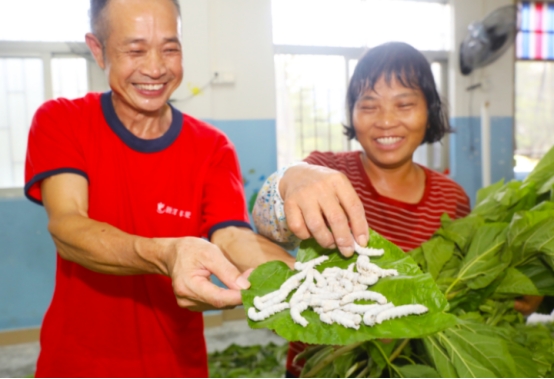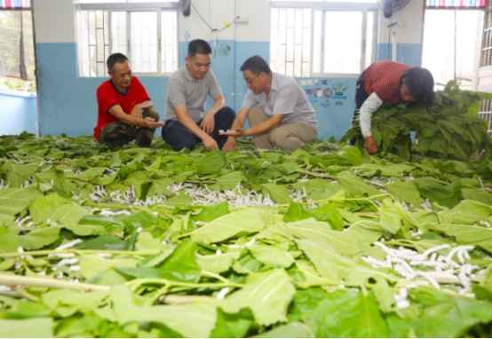 “怎么才能把蠶寶寶喂得肥肥白白?”“它們又是怎么吐絲的?”在養(yǎng)蠶基地,華南農(nóng)業(yè)大學、絲紡集團的專家教授現(xiàn)場為村民開展“蠶桑技術課堂”培訓,為提高蠶繭質(zhì)量和產(chǎn)量奠定技術基礎?!敖?jīng)過專家前期育種,現(xiàn)在的年產(chǎn)批次由原來的9批擴大到18批,蠶繭產(chǎn)量得到了很大的提高?!贝饲霸鴵谓z紡集團所屬絲源集團副總經(jīng)理的李林山說,通過與華南農(nóng)業(yè)大學的專家教授合作,運用小蠶(大蠶)補濕育、綠葉保濕、蠶房灑水補濕等繁育技術,解決持續(xù)高溫天氣下蠶病頻發(fā)問題,有效提高了蠶農(nóng)養(yǎng)蠶技術。