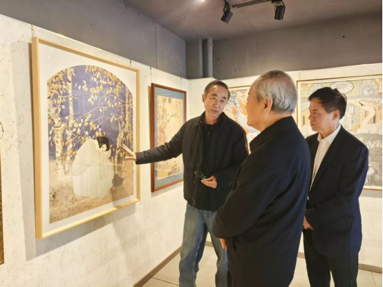 李加林向杜鈺洲系統(tǒng)介紹了現(xiàn)代織錦的創(chuàng)作理念與近期推出的系列新作。這些作品融合數(shù)碼織造技術與創(chuàng)新工藝,在題材表達與工藝精細度上均取得重要突破,展現(xiàn)出織錦藝術在當代語境下的創(chuàng)新活力。杜鈺洲駐足細觀,對作品在色彩漸變層次與細節(jié)呈現(xiàn)等方面體現(xiàn)出的藝術表現(xiàn)力表示高度贊賞。