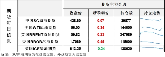 【1】WTI主力原油期貨收漲0.19美元,漲幅0.34%,報(bào)56美元/桶;布倫特主力原油期貨收漲0.14美元,漲幅0.23%,報(bào)59.82美元/桶;INE原油期貨收漲0.07%,報(bào)428.6元。