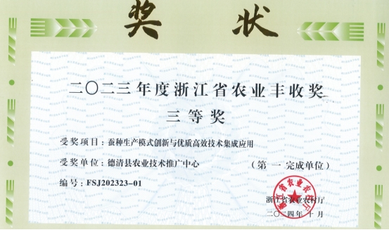 通過(guò)院企合作,試驗(yàn)篩選繁育系數(shù)高、農(nóng)村好養(yǎng)高產(chǎn)、繭絲性能優(yōu)良的家蠶新品種“農(nóng)科5號(hào)”“水星1號(hào)”“中2016×日2016”推廣飼養(yǎng)。通過(guò)自主創(chuàng)新,集成優(yōu)良特色蠶品種繁育、種繭育高產(chǎn)桑園栽培、小蠶規(guī)模共育、大蠶省力化飼養(yǎng),開(kāi)展桑園土壤病原菌及其微生態(tài)調(diào)查,研究微粒子病防控技術(shù)在蠶種繁育中的應(yīng)用,推進(jìn)了良種良法優(yōu)質(zhì)高效技術(shù)的示范。2021年以來(lái),主持發(fā)布市、縣相關(guān)地方標(biāo)準(zhǔn)2個(gè),主持發(fā)明專利和實(shí)用新型專利獲授權(quán)3項(xiàng),主持“蠶種生產(chǎn)模式創(chuàng)新與優(yōu)質(zhì)高效技術(shù)集成應(yīng)用”項(xiàng)目獲2023年度浙江省農(nóng)業(yè)豐收三等獎(jiǎng)。德清蠶種產(chǎn)業(yè)的持續(xù)創(chuàng)新,為蠶種“一帶一路”出口提供了技術(shù)支撐。