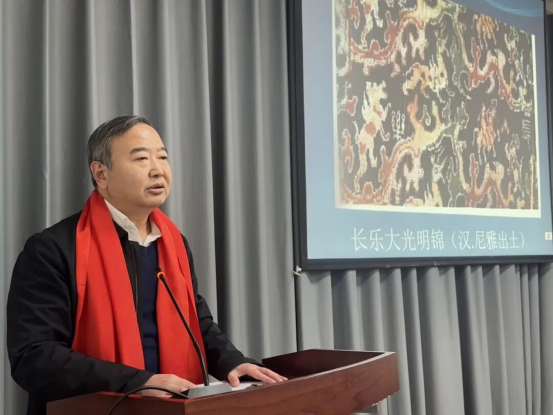 四川省絲綢科學(xué)研究院黨委書記、董事長程明在致辭中指出,這件國寶不僅是漢代絲綢技藝的巔峰之作,更是中華文明多元一體、東西交流的生動見證。它的出土為研究古代絲綢技術(shù)、紋樣藝術(shù)、歷史文化乃至天文觀念打開了珍貴窗口,也時刻提醒當(dāng)代絲綢人肩負(fù)的歷史責(zé)任。他介紹,四川省絲綢科學(xué)研究院長期致力于絲綢科技與文化遺產(chǎn)保護(hù),近年來在蜀錦蜀繡非遺數(shù)字化保護(hù)、紋樣數(shù)據(jù)庫建設(shè)、以及蜀錦與香云紗雙非遺融合產(chǎn)品創(chuàng)新等方面取得了系列成果。程明表示,紀(jì)念“五星出東方”出土三十周年,不僅是一次文化致敬,更是面向未來的再出發(fā),期待凝聚各界力量,構(gòu)建協(xié)同機(jī)制,讓中華絲綢文明持續(xù)綻放光彩。
