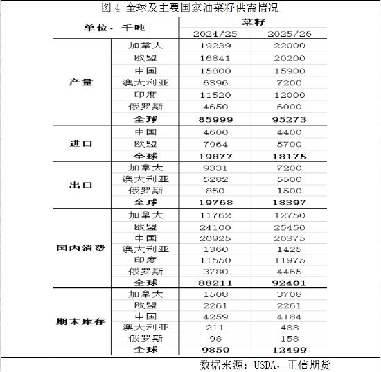 各機(jī)構(gòu)預(yù)計(jì)2025年加菜籽(5208, 89.00, 1.74%)產(chǎn)量高達(dá)2000-2200萬噸,2025/26年度澳、歐、俄油菜籽產(chǎn)量預(yù)估分別增80、340和135萬噸,全球產(chǎn)量約增930萬噸,庫存增超260萬噸,整體供應(yīng)趨于寬松。一方面,在中國多元進(jìn)口結(jié)構(gòu)下,澳俄增產(chǎn)將提供更多的菜籽菜油出口至中國,擠占加拿大市場份額;另一方面,加產(chǎn)量大增,出口市場未見好轉(zhuǎn),2025/26年度初至12月14日,加拿大菜籽僅出口243.39萬噸,同比大降42.1%,年度出口調(diào)降230萬噸,壓榨維持較高水平,但不足以消化出口減量,預(yù)計(jì)2025/26年度加菜籽期末庫存回升至250萬噸,供應(yīng)轉(zhuǎn)寬松。供應(yīng)寬松預(yù)期壓制全球菜系價(jià)格下跌。