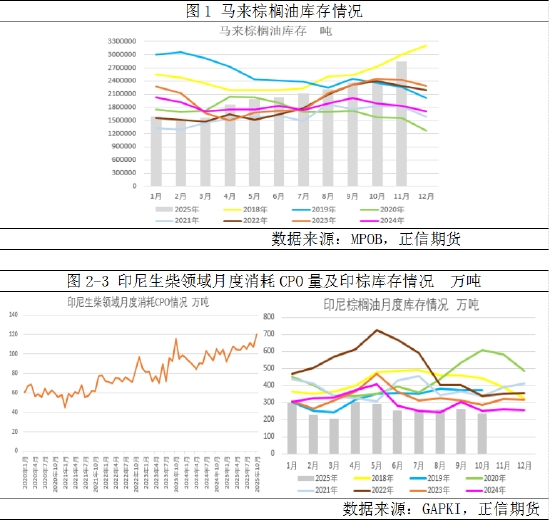 2025年前10個(gè)月印尼毛棕累計(jì)產(chǎn)量4394萬噸,同比增近10%;6-8月棕櫚油產(chǎn)量較高,9月大幅回落進(jìn)行修正,10月有所回升不過仍處于近幾年同期低位。前10個(gè)月累計(jì)消費(fèi)2066萬噸,同比增5.2%;其中生柴端累計(jì)消費(fèi)1060萬噸,同比增12.6%,10月生柴端消耗更是高達(dá)120萬噸,側(cè)面反應(yīng)印尼B40推進(jìn)良好。前10個(gè)月累計(jì)出口2770萬噸,同比增13.4%。供需雙增,10月印棕庫存降至233.3萬噸,已連續(xù)17個(gè)月在300萬噸及300萬噸以下。