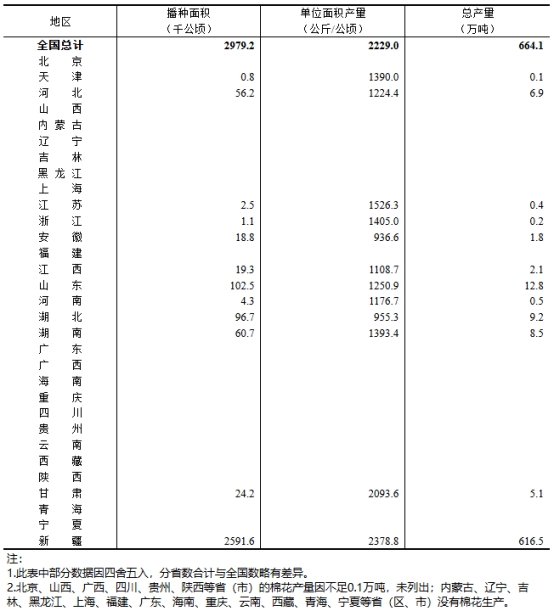 根據(jù)對(duì)全國(guó)31個(gè)省(區(qū)、市)的統(tǒng)計(jì)調(diào)查(新疆棉花播種面積通過遙感測(cè)量取得),2025年全國(guó)棉花播種面積、單位面積產(chǎn)量和總產(chǎn)量分別如下: