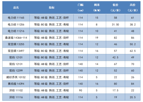 本周綢緞指數(shù)協(xié)作單位成交價格區(qū)間