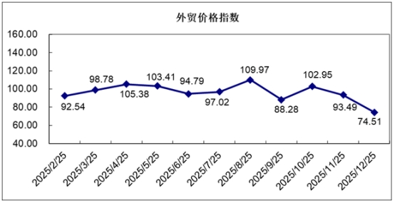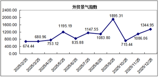如圖1、圖2所示,2025年12月份外貿景氣指數(shù)收于1344.95點,環(huán)比上漲23.84%,較年初比上漲97.33%,去年同比上漲89.01%;外貿價格指數(shù)收于74.51點,環(huán)比下跌20.31%,較年初比下跌31.22%,去年同比下跌37.97%;外貿信心指數(shù)收于1013.28點,環(huán)比上漲0.20%。