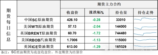 【1】WTI主力原油期貨收跌1.19美元,跌幅2.04%,報57.13美元/桶;布倫特主力原油期貨收跌1.06美元,跌幅1.72%,報60.7美元/桶;INE原油期貨收跌0.28%,報426.1元。