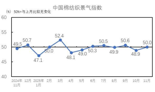 說明:中國棉紡織行業(yè)景氣指數(shù)采集自全國近500家次棉紡織企業(yè),參考國家制造業(yè)PMI等指數(shù)制定方式,通過對多個(gè)主要指標(biāo)加權(quán)計(jì)算得出,當(dāng)指數(shù)高于50,表示棉紡織行業(yè)本月景氣程度好于上月,低于50則表示本月景氣程度不及上月。