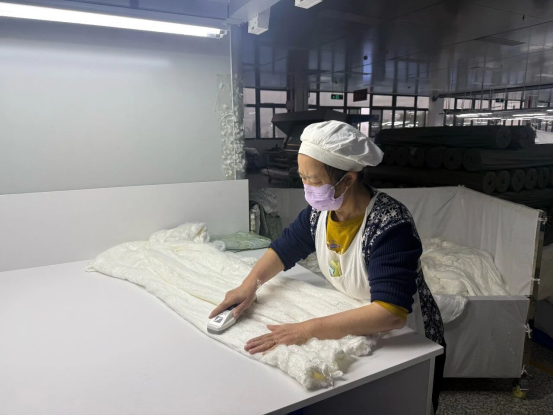 與此同時,倉儲發(fā)貨區(qū)一派熱火朝天,工人們分秒必爭地打包、貼單,一床床檢驗合格的蠶絲被被快速分揀裝車,通過物流發(fā)往各地。