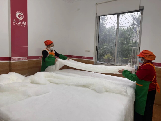 近日,在廣西嘉聯絲綢股份有限公司、廣西劉三姐家居文化有限公司的生產車間里,蠶絲被制作工作正有條不紊地推進。經過多道預處理的桑蠶長絲瑩白柔軟,工人們分工協作,完成手工拉制、定點縫制、壓邊縫合等工序,再經嚴格質檢后裝入芯套,一床床兼具品質與溫度的蠶絲被便新鮮出爐?!啊止だ啤@一步,全憑手上的功夫。這蠶絲必須要一層層拉得很蓬松,這樣蓋在身上才暖和,這就是咱們宜州蠶絲被‘貼身保暖’的秘訣?!眲⑷慵揖游幕邢薰竟と藯钆拷榻B道。