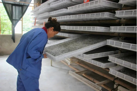 技術(shù)員在小蠶共育室查看小蠶培育情況
