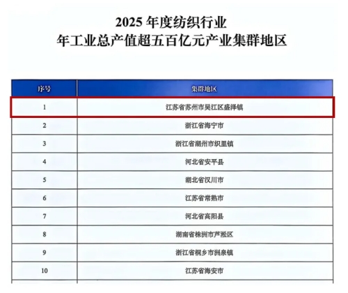 近日,中國紡織工業(yè)聯(lián)合會產(chǎn)業(yè)集群工作委員會正式公布全國紡織產(chǎn)業(yè)集群發(fā)展情況調(diào)研成果,盛澤鎮(zhèn)在2025年度紡織行業(yè)年工業(yè)總產(chǎn)值超五百億元產(chǎn)業(yè)集群地區(qū)名單中位列榜首。