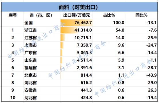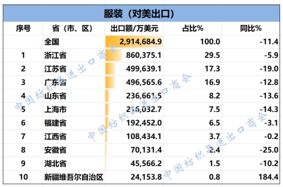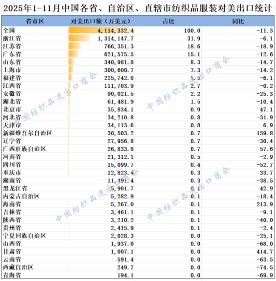 2025年1-11月,我國紡織服裝累計對美出口411.43億美元,同比下降11.3%。浙江省、江蘇省、廣東省、山東省、上海分別列全國紡織服裝對美出口省市前五位,合計比重超八成。