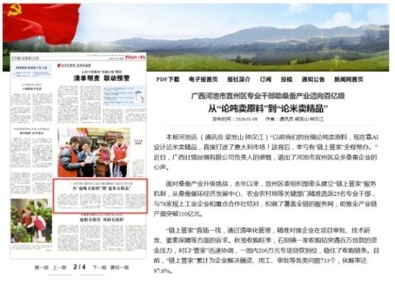 1月8日出版的《中國組織人事報(bào)》刊發(fā):《廣西河池市宜州區(qū)專業(yè)干部助桑蠶產(chǎn)業(yè)邁向百億級 從“論噸賣原料”到“論米賣精品”》。全文如下。