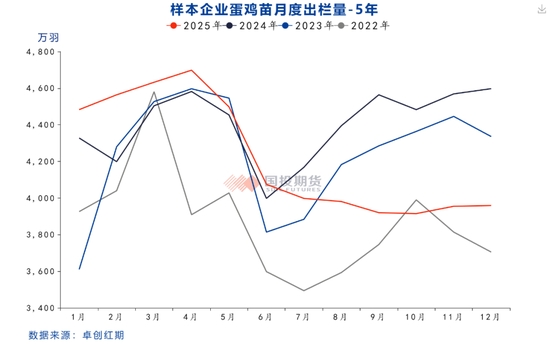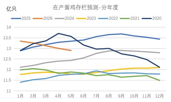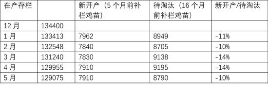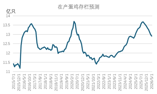 從雞苗補(bǔ)欄情況來看,2025年7月開始,樣本雞苗補(bǔ)欄量(占實(shí)際補(bǔ)欄占比50%)開始同比下滑,且下半年雞苗補(bǔ)欄同比下滑幅度逐月擴(kuò)大。數(shù)據(jù)顯示,8-12月雞苗單月銷量同比降幅分別為9.4%、14.1%、12.7%、13.4%及13.9%,基本每個(gè)月的同比降幅都在10%左右。我們用雞苗補(bǔ)欄后5個(gè)月開產(chǎn)進(jìn)行測(cè)算,預(yù)計(jì)2026年1月至2026年5月期間,新開產(chǎn)蛋雞數(shù)量將持續(xù)處于低位。2025年下半年行業(yè)低迷的補(bǔ)欄將使得2026年上半年蛋雞新開產(chǎn)壓力顯著降低。