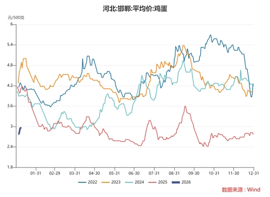 2025年四季度,雞蛋(3976, -26.00, -0.65%)現(xiàn)貨價(jià)格持續(xù)低位震蕩。不過自元旦開始,雞蛋現(xiàn)貨價(jià)格出現(xiàn)小幅走強(qiáng)跡象。以河北敦樸貿(mào)易為例,45斤雞蛋報(bào)價(jià)從1月1日的121元上漲至1月8日131元。我們分析認(rèn)為,1月份開始雞蛋現(xiàn)貨價(jià)格將逐步具備走強(qiáng)動(dòng)能。