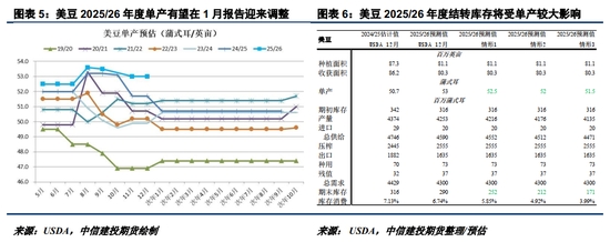 美國(guó)政府的停擺令USDA錯(cuò)失10月報(bào)告,停擺結(jié)束后的11月報(bào)告因缺乏完整數(shù)據(jù)對(duì)單產(chǎn)調(diào)整謹(jǐn)慎,而12月報(bào)告則依慣例未調(diào)整平衡表,令美豆2025/26年度單產(chǎn)預(yù)估仍維持53蒲式耳/英畝高位,尚未反應(yīng)美豆產(chǎn)區(qū)8月偏差降雨對(duì)單產(chǎn)的不利影響。在此背景下,USDA 1月的定產(chǎn)報(bào)告如何調(diào)整單產(chǎn)預(yù)估將十分關(guān)鍵,因其將決定直到10月報(bào)告前的美豆2025/26年度產(chǎn)量形勢(shì)及供需狀況。市場(chǎng)平均預(yù)估USDA將小幅調(diào)降2025/26年度美豆單產(chǎn)預(yù)估至52.7,對(duì)比2024/25年度的天氣及50.7的單產(chǎn),該預(yù)期似乎有些高,這令單產(chǎn)超預(yù)期調(diào)降的可能性增加。