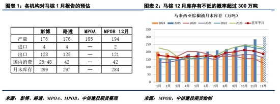 盡管如此,且馬棕10-12月產(chǎn)量同比增幅擴(kuò)大仍是隱憂,隨著季節(jié)性減產(chǎn)推進(jìn)及1月中下旬印度齋月備貨啟動(dòng),我們預(yù)計(jì)馬棕12月庫(kù)存見頂?shù)目赡苄暂^高,今年1季度有望進(jìn)入去庫(kù)狀態(tài),馬棕1月高頻產(chǎn)需數(shù)據(jù)已顯示一定邊際利多。下周一的MPOB月報(bào)后,棕櫚油價(jià)格可能再度迎來(lái)利空出盡,預(yù)計(jì)P05在8300附近的支撐將較強(qiáng)。