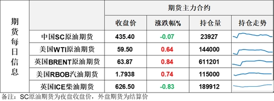 【1】WTI主力原油期貨收漲0.38美元,漲幅0.64%,報59.5美元/桶;布倫特主力原油期貨收漲0.53美元,漲幅0.84%,報63.87美元/桶;INE原油期貨收跌0.07%,報435.4元。