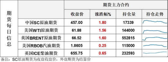 【1】WTI主力原油期貨收漲0.95美元,漲幅1.56%,報61.88美元/桶;布倫特主力原油期貨收漲1.05美元,漲幅1.6%,報66.52美元/桶;INE原油期貨收漲1.8%,報457元。
