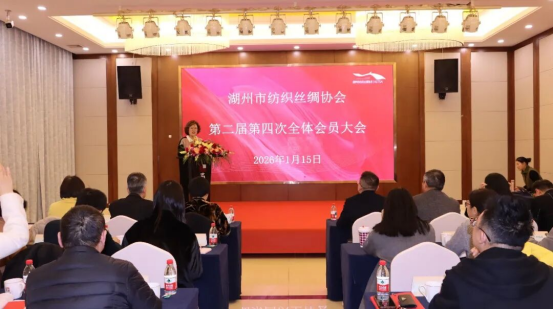 舊歲已展千重錦,新年再進百尺竿。2026年1月15日,湖州市紡織絲綢協(xié)會第二屆第四次會員大會順利召開。中國絲綢協(xié)會副會長、中國絲綢工業(yè)有限公司總經理李欣,浙江省絲綢協(xié)會會長、浙江凱喜雅國際股份有限公司黨委副書記兼紀委書記李振強到會指導,湖州市經信局、市民政局、市貿促會等相關部門負責人出席會議,湖州市100余位紡織絲綢企業(yè)代表參會。