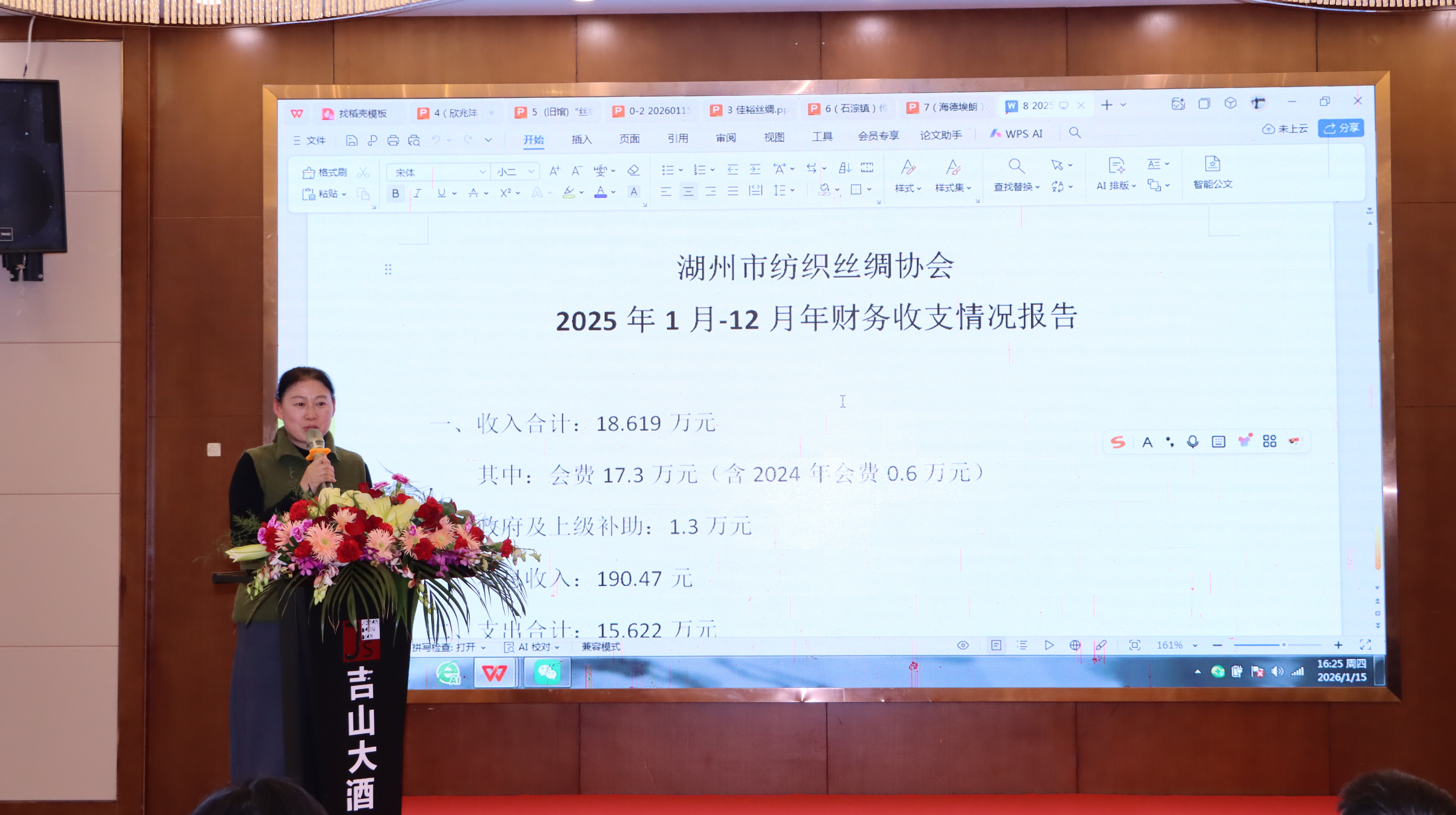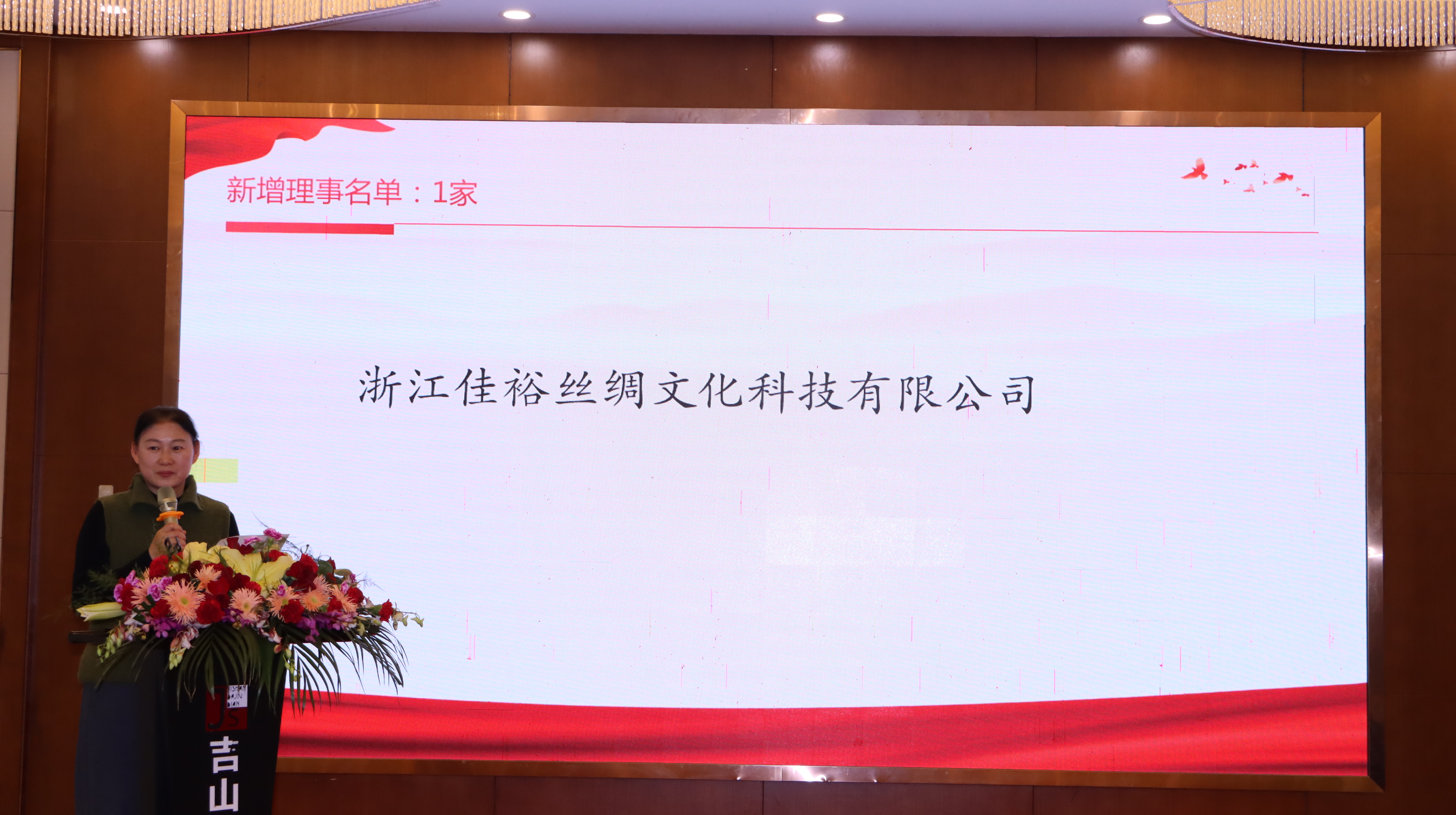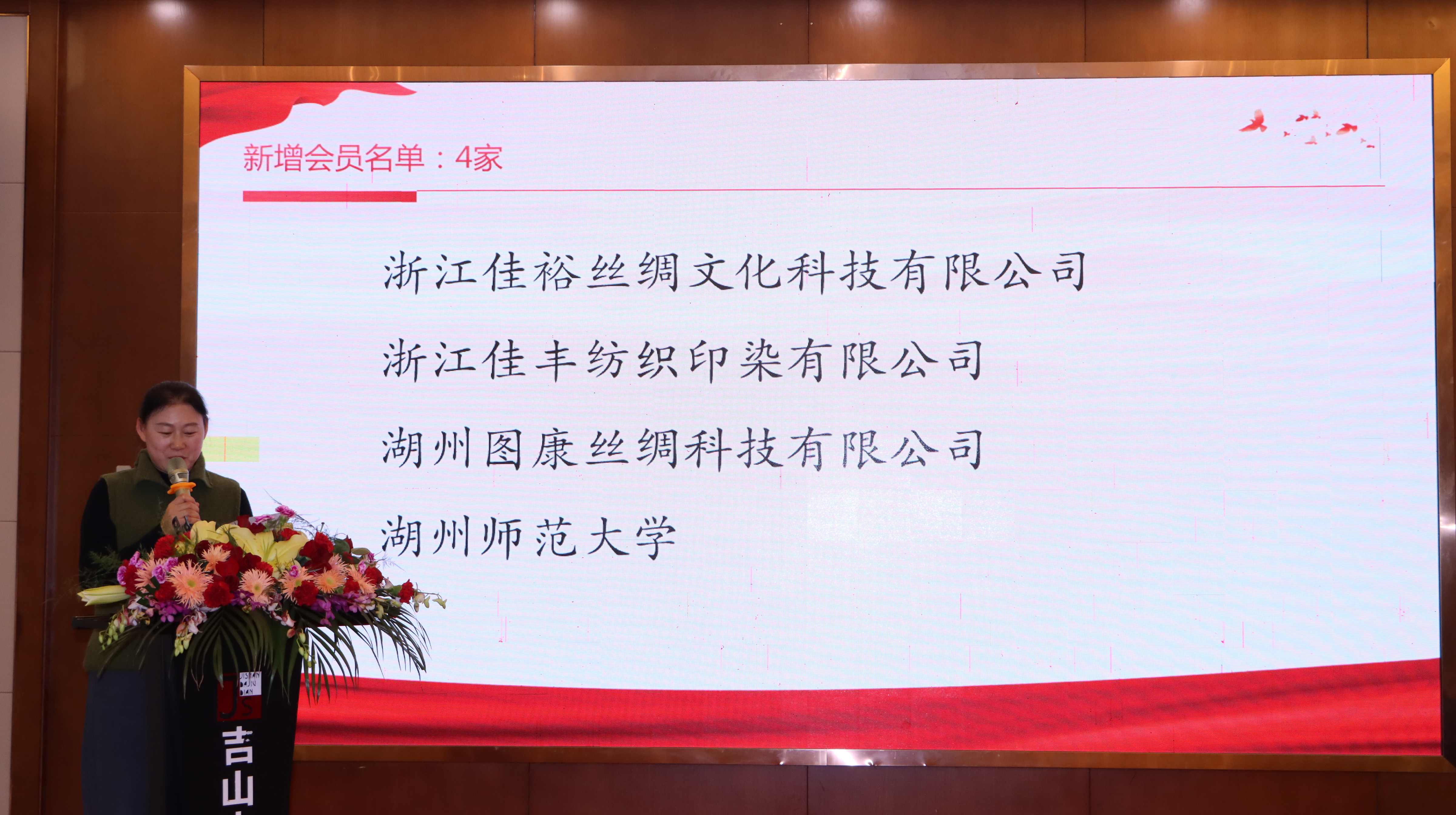 湖州市絲綢紡織協(xié)會秘書長龔玲,代表協(xié)會作《2025年度財務收支報告》的說明及理事(浙江佳裕絲綢文化科技有限公司)的議案,均獲大會審議通過。
