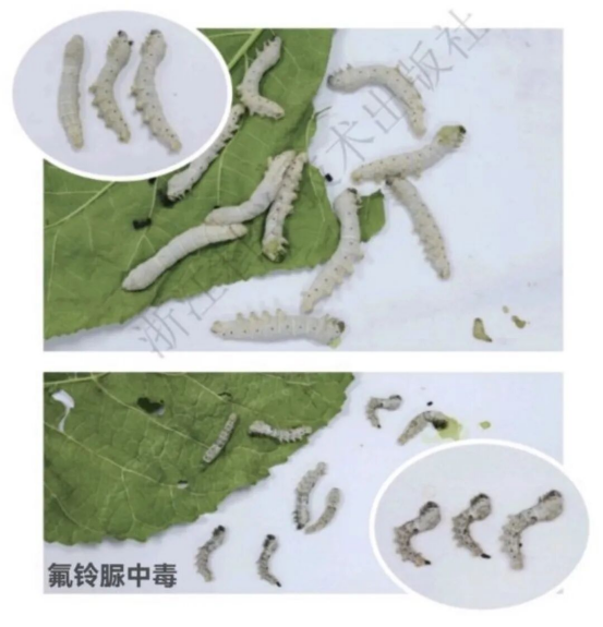氟鈴脲導致桑蠶急性中毒癥狀為不吃、不動、不吐液,1天后蠶體僵直、側倒,觸之能動,有假死現(xiàn)象;慢性中毒則食桑不旺,不亂爬、不搖頭、不吐液,蠶體瘦小,表皮僵硬,部分蠶皮膚破裂。多數(shù)蠶入眠推遲,個別蠶不能蛻皮,發(fā)育開差拉大,群體發(fā)育不齊。