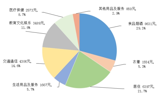 2025年,全國(guó)居民人均食品煙酒消費(fèi)支出8631元,增長(zhǎng)2.6%,占人均消費(fèi)支出的比重為29.3%;人均衣著消費(fèi)支出1554元,增長(zhǎng)2.2%,占人均消費(fèi)支出的比重為5.3%;人均居住消費(fèi)支出6397元,增長(zhǎng)2.1%,占人均消費(fèi)支出的比重為21.7%;人均生活用品及服務(wù)消費(fèi)支出1667元,增長(zhǎng)7.7%,占人均消費(fèi)支出的比重為5.7%;人均交通通信消費(fèi)支出4306元,增長(zhǎng)8.3%,占人均消費(fèi)支出的比重為14.6%;人均教育文化娛樂消費(fèi)支出3489元,增長(zhǎng)9.4%,占人均消費(fèi)支出的比重為11.8%;人均醫(yī)療保健消費(fèi)支出2573元,增長(zhǎng)1.0%,占人均消費(fèi)支出的比重為8.7%;人均其他用品及服務(wù)消費(fèi)支出859元,增長(zhǎng)11.2%,占人均消費(fèi)支出的比重為2.9%。