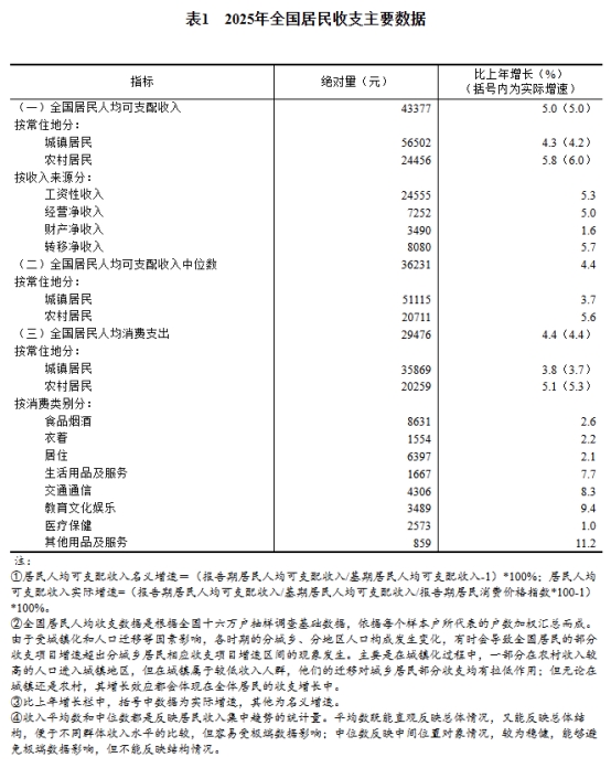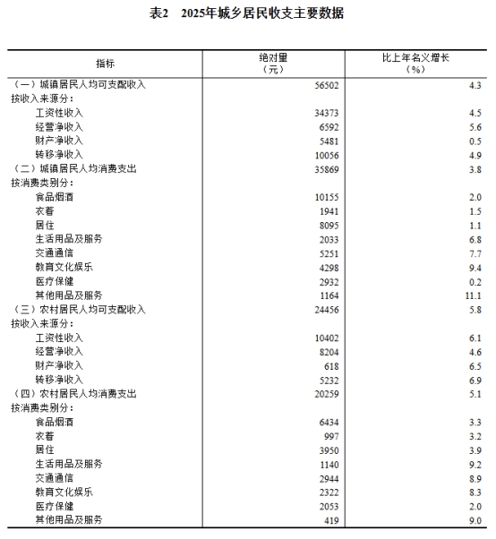 2025年,全國(guó)居民人均可支配收入43377元,比上年名義增長(zhǎng)5.0%,扣除價(jià)格因素,實(shí)際增長(zhǎng)5.0%。分城鄉(xiāng)看,城鎮(zhèn)居民人均可支配收入56502元,增長(zhǎng)(以下如無特別說明,均為同比名義增長(zhǎng))4.3%,扣除價(jià)格因素,實(shí)際增長(zhǎng)4.2%;農(nóng)村居民人均可支配收入24456元,增長(zhǎng)5.8%,扣除價(jià)格因素,實(shí)際增長(zhǎng)6.0%。