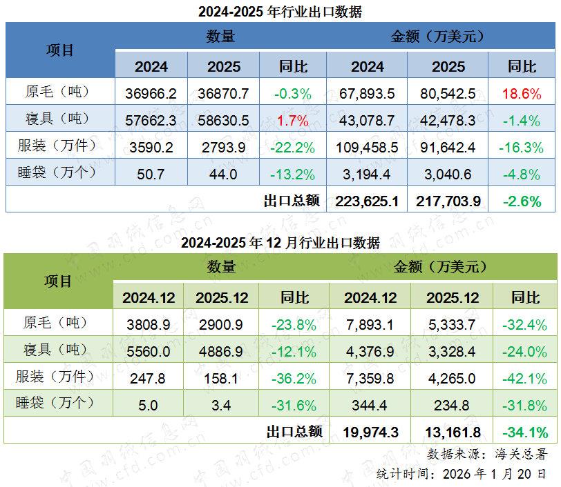 2025年,我國(guó)羽絨行業(yè)出口總額約21.8億美元,與2024年相比小幅下滑2.6%。其中,原毛出口量同比基本持平,但出口額增長(zhǎng)18.6%,反映原毛出口平均單價(jià)有較大幅度上漲;寢具出口量值基本保持平穩(wěn),出口量同比小幅上漲1.7%,出口額小幅下滑1.4%;服裝出口量值齊跌,出口量同比下滑22.2%,出口額下降16.3%。